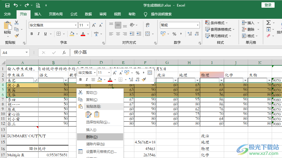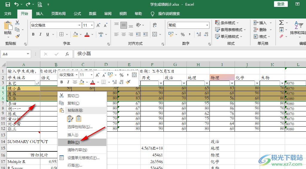 5、第五步,完成筛选之后表格中有颜色的行就会自动排列在一起,此时我们选中这些行,然后右键单击选择“删除”选项即可