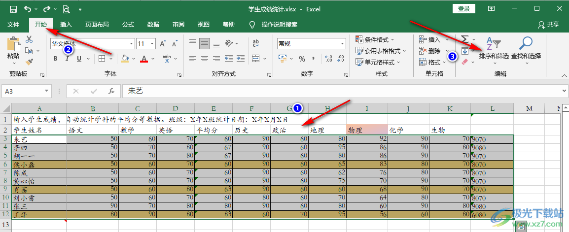 2、第二步,进入文档编辑页面之后,我们在页面中先完成数据的输入以及表格的制作,接着选中我们制作好的表格,然后在工具栏中点击“开始”选项,再在“开始”的子工具栏中找到“筛选”工具