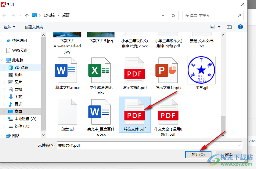 2、第二步,点击该选项之后,我们进入文件夹页面,在文件夹中我们找到自己想要转换格式的PDF文件,然后点击“打开”选项