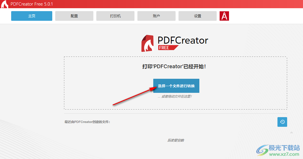 1、第一步,我们先在电脑中打开pdf creator软件,然后在软件页面中点击“选择一个文件进行转换”选项