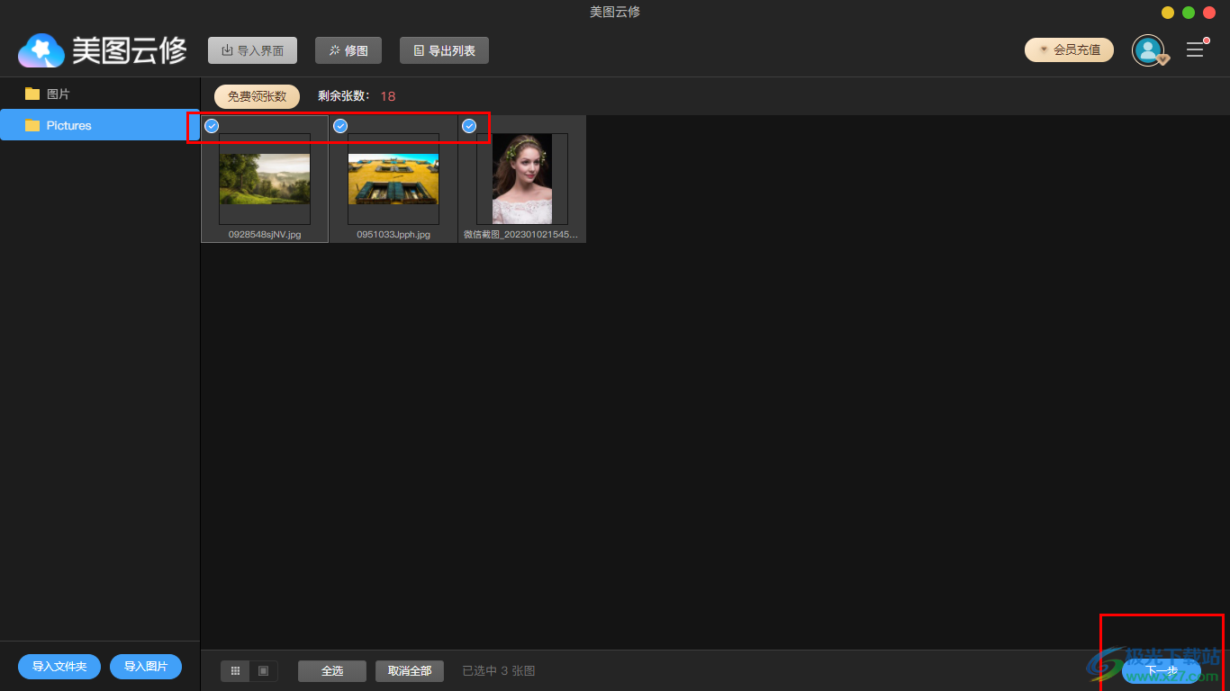 2.导入进来的图片进行勾选,然后再点击右下角的【下一步】按钮进入到修图的操作页面中。