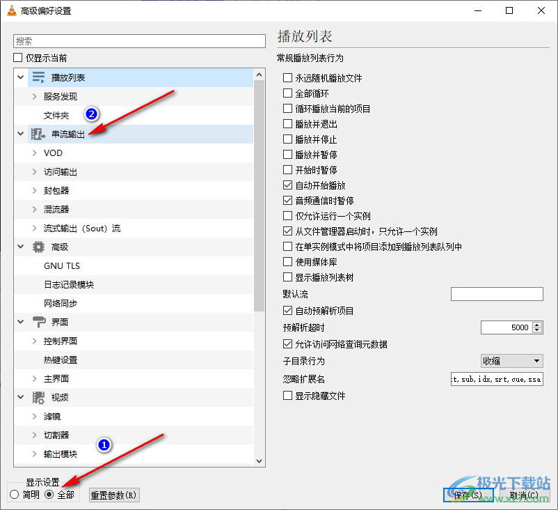 3、第三步,打开“偏好设置”选项之后,我们在页面下方先将“简明”改为“全部”,再在页面左侧找到“串流输出”选项,点击打开该选项