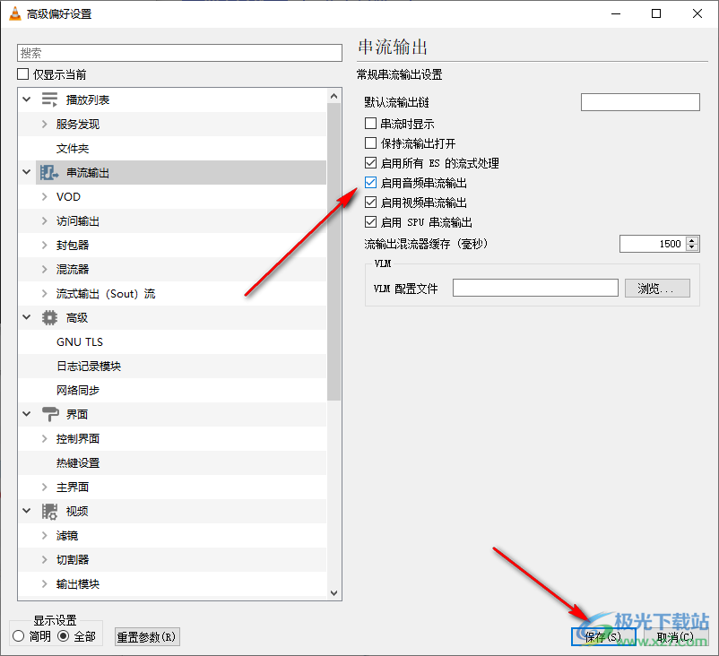 5、第五步,我们将“启用音频串流输出”选项进行勾选,然后在页面下方点击“保存”选项即可