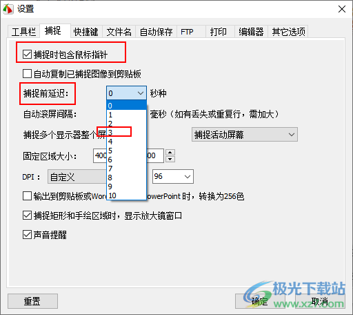 4.在打开的页面中,【捕捉时包含鼠标指针】这个选项是没有勾选的,我们将该选项勾选上,然后在【捕捉前延迟】后面的下拉按钮点击打开,选择自己需要延迟的时间,一般选择【3】就差不多了。