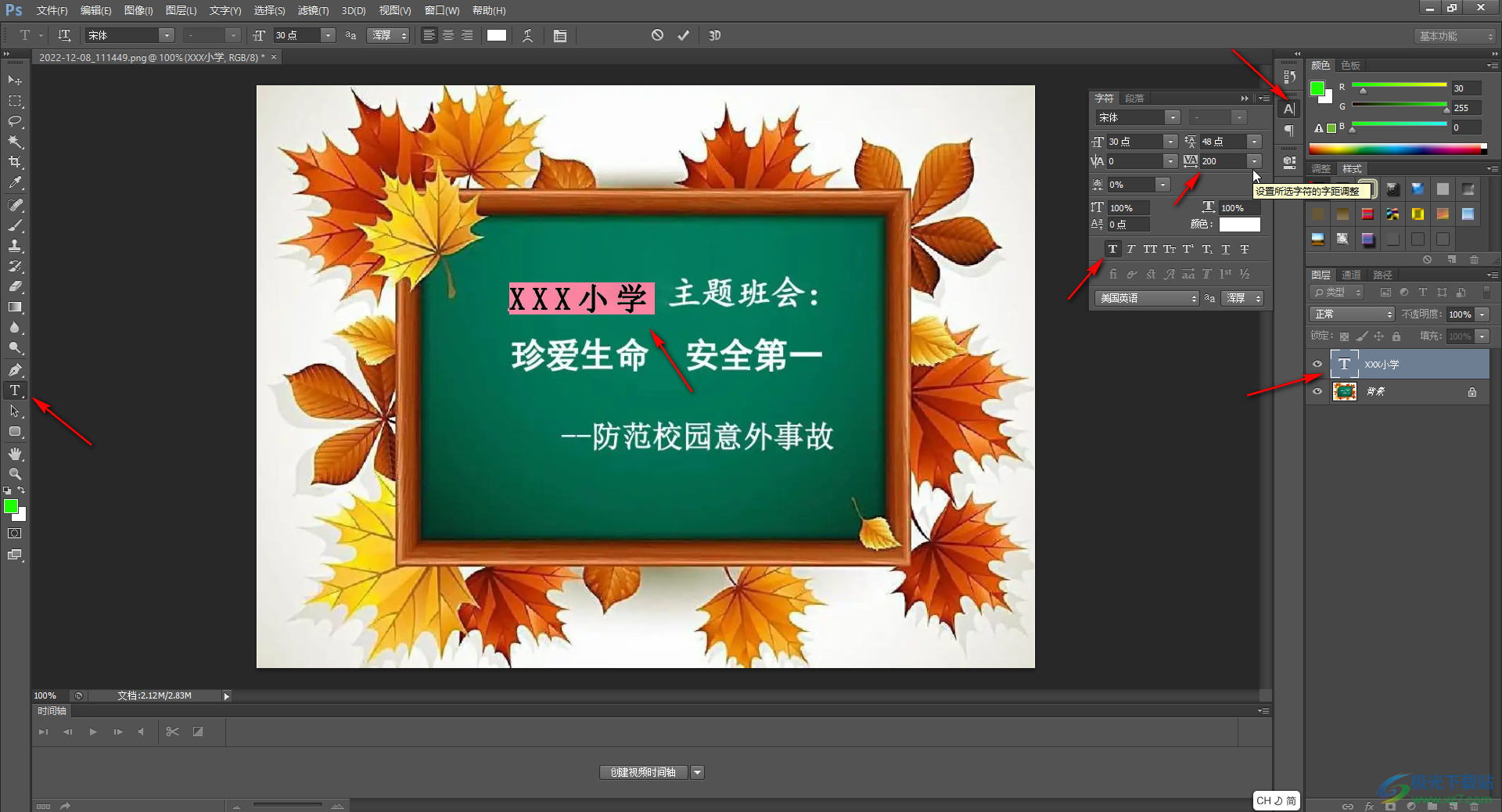 第四步:如果后续需要修改文字格式,可以在界面右侧点击选中文字图层,在界面左侧点击且换到文字工具,然后选中需要修改的文字,在界面右侧点击A按钮打开字符面板(也可以在“窗口”选项卡中点击“字符”按钮打开),在其中我们可以适当调整文字的间距,设置加粗斜体等格式,设置完成后点击上方的√图标进行确认就可以了;