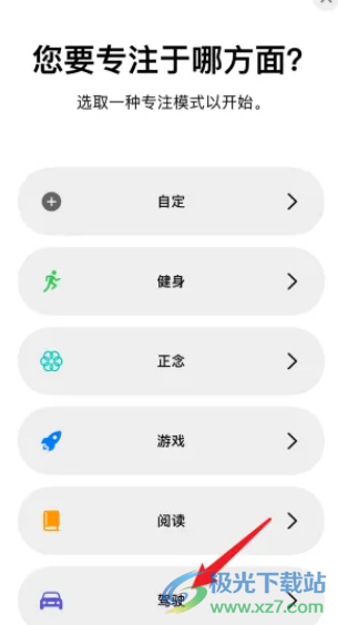 3.在打开的专注模式页面中,里面含有健身、游戏、阅读等选项,用户选择其中的驾驶选项就可以了