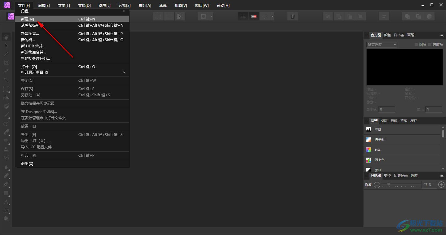 1.在【文件】选项的窗口下,将【新建】按钮进行点击,在页面上新建一个空白画布。