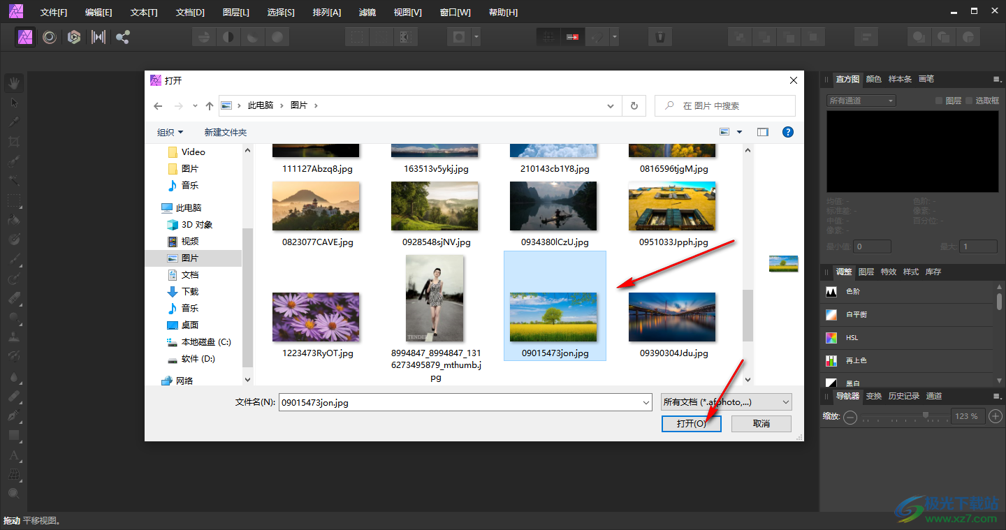 2.这时在打开的页面中选择自己想要导入到操作页面中的照片,将其选中之后点击右下角的【打开】按钮进行导入。