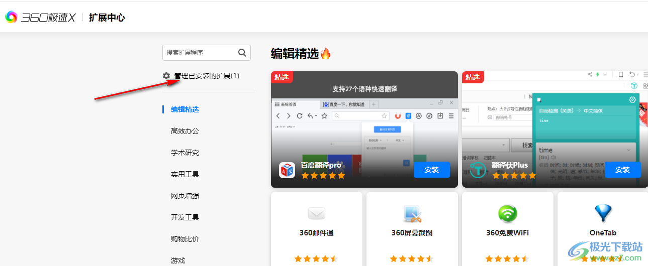 2、第二步,进入更多扩展页面之后,我们在该页面中点击打开“管理已安装的扩展”选项