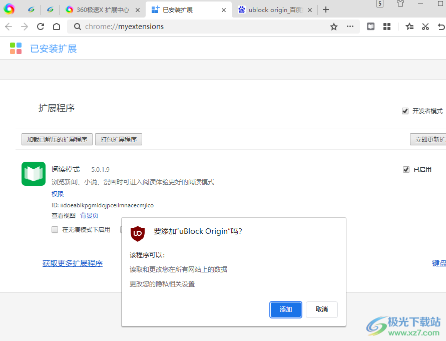 以上就是小编整理总结出的关于ublock origin插件安装的方法,我们打开浏览器中的扩展图标,然后在扩展管理页面中将开发者模式进行勾选,再将ublock origin插件的文件拖入浏览器中,最后在安装弹框中点击“添加”选项即可,感兴趣的小伙伴快去试试吧。