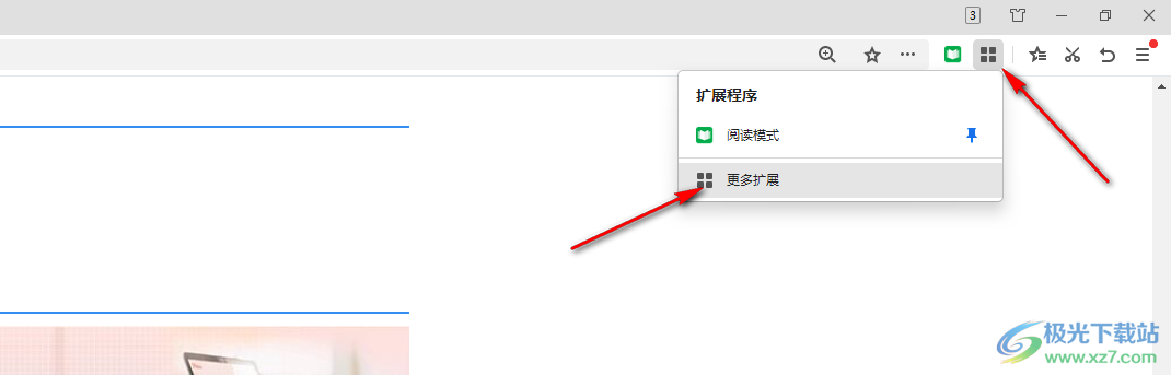 1、第一步,我们先下载并解压该插件,然后打开一个浏览器,在浏览器中,我们找到扩展图标,打开该图标,然后在下拉列表中选择“更多扩展”选项