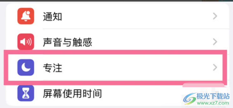 1.首先用户打开苹果手机并在桌面上点击设置图标,接着进入到设置页面中用户选择其中的专注选项