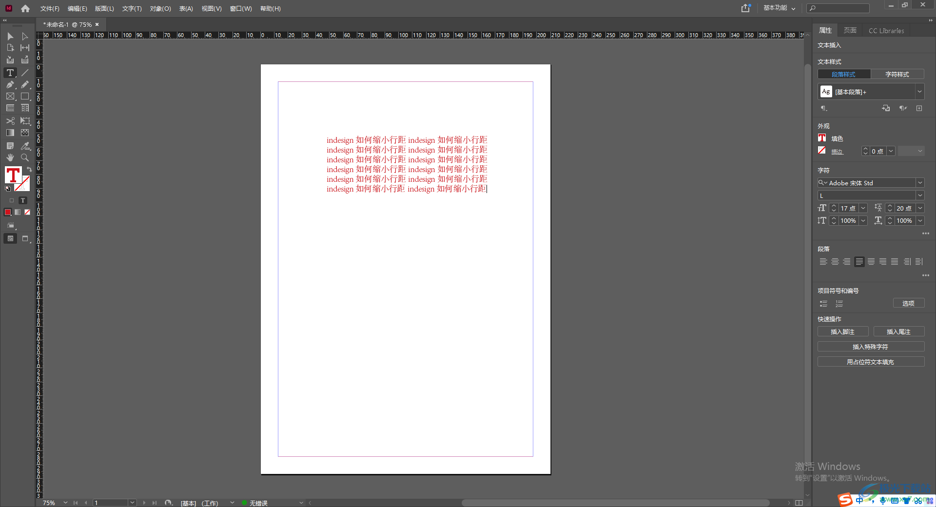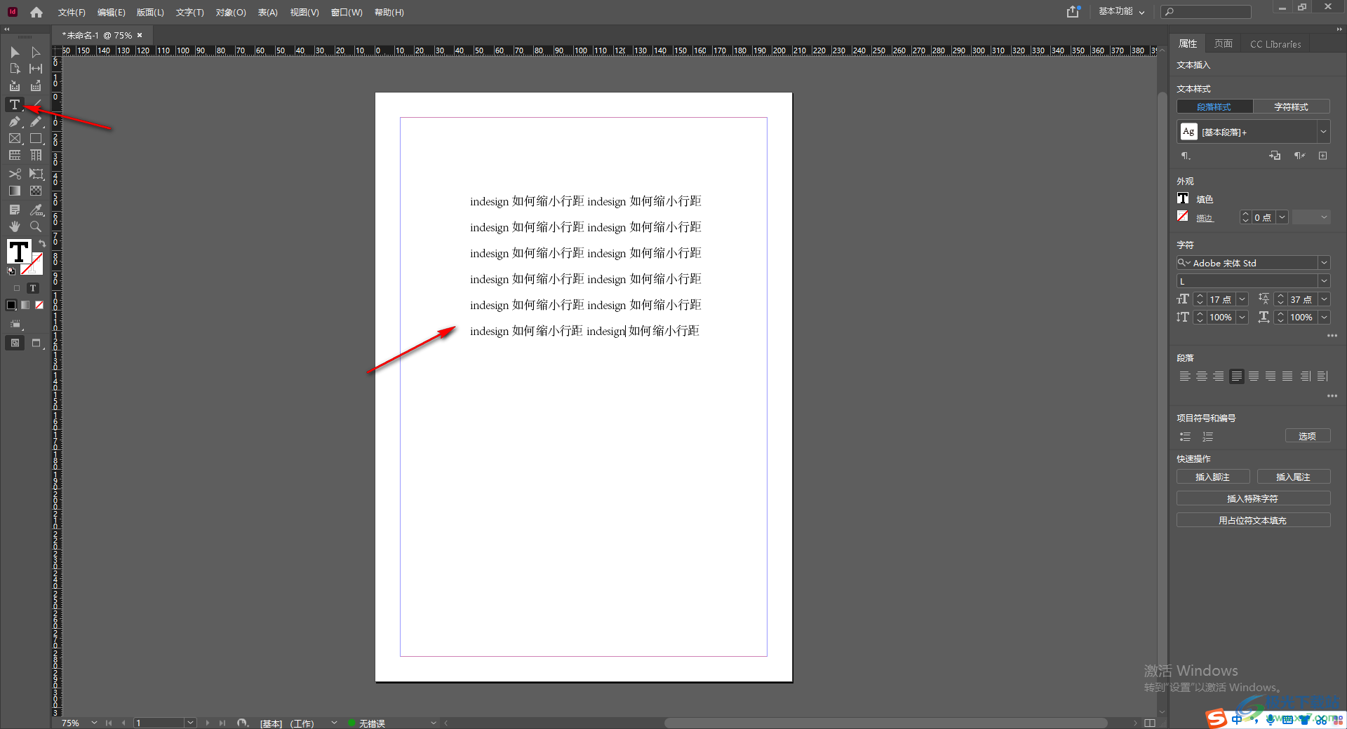 如果你想要让小编推荐一款非常好用的书籍排版工具软件,那么必须是Adobe indesign,这款软件有着非常丰富的操作功能,并且可以很好的帮助你编辑出自己需要的一个书籍排版页面,我们在使用Adobe indesign进行文字编辑的时候,有时候为了让文字内容显示得更加的完美和好看,就会对文字的行距、字体等进行设置,有的小伙伴在编辑的过程中,出现文字行距非常宽的情况,那么这种情况应该是你之前编辑文字的时候,留下的一个行距参数,那么我们只需要将行距的参数数值调小一点就好了,那么文字的行距就会缩小显示,下方是关于如何使用Adobe indesign缩小文字行距的具体操作方法,如果你需要的情况下可以看看方法教程,希望可以帮助到大家。