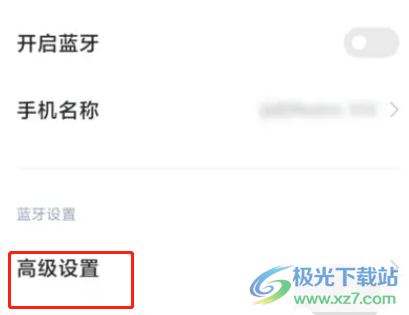 3.页面发生切换,用户在打开的蓝牙页面中,可以看到有开启蓝牙、手机名称、高级设置等选项,用户点击其中的高级设置选项