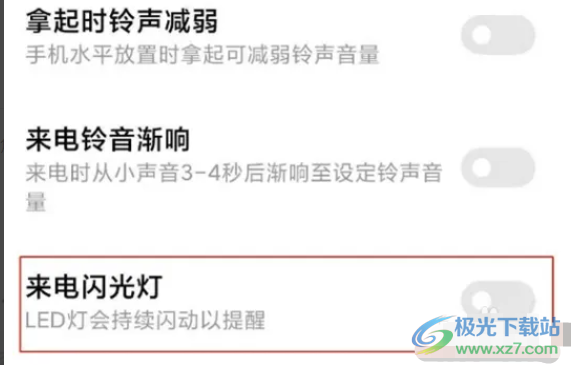 3.在打开的来电时状态页面中,用户直接将位于底部的来电闪光灯右侧的开关按钮打开即可解决问题
