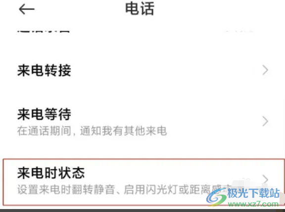 2.这时进入到电话设置页面,用户可以看到有来电转接、来电等待、来电时状态等选项,选择其中的来电时状态选项