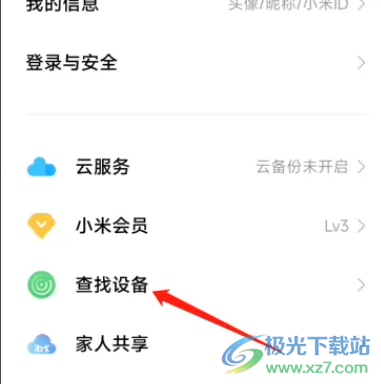 2.页面将会发生跳转,在打开的小米账号页面中,用户可以看到有小米会员、查找设备、家人共享等选项,需要选择其中的查找设备选项