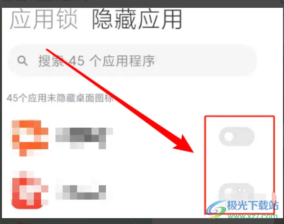 3.这时用户进入到隐藏应用页面中,将需要从桌面隐藏的应用右侧开关按钮打开即可解决问题