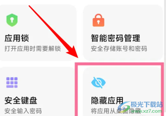 2.页面发生跳转,在打开的隐私保护页面中,用户可以看到有应用锁、安全键盘、智能密码管理等选项,需要选择其中的隐藏应用选项