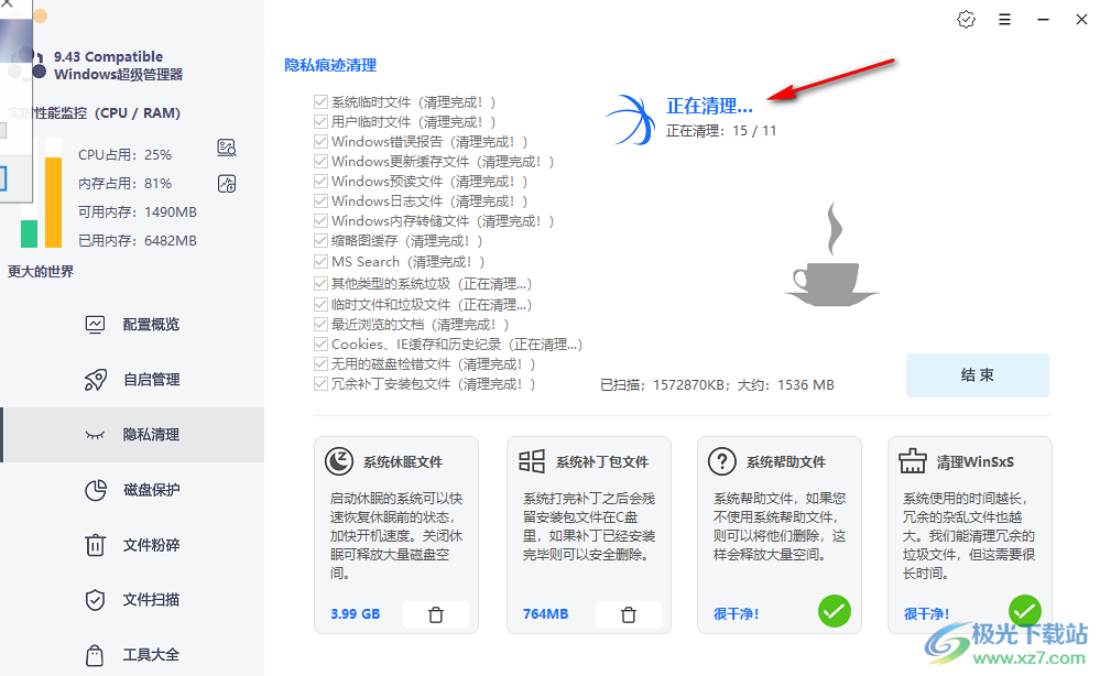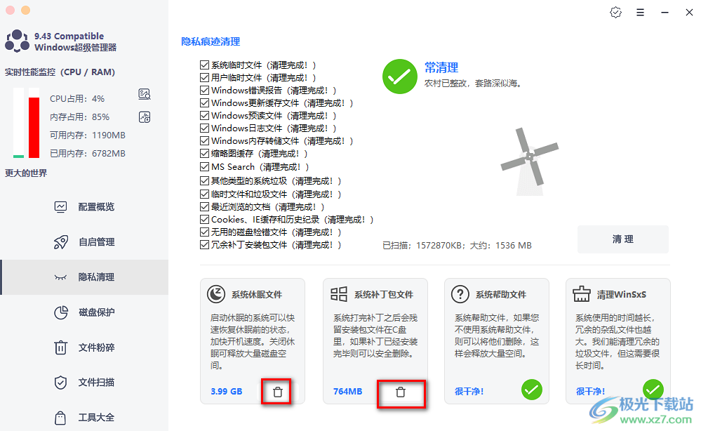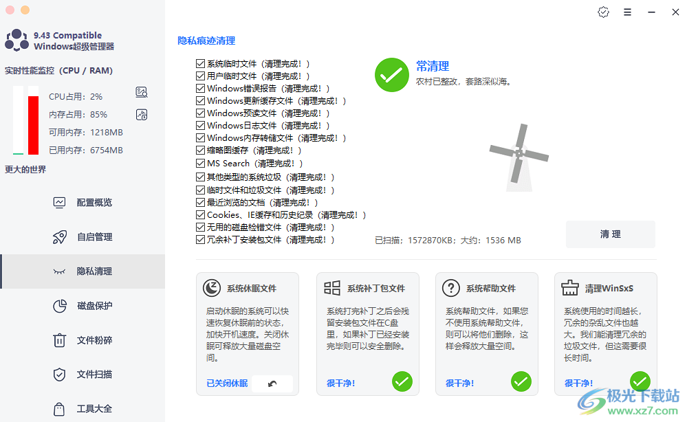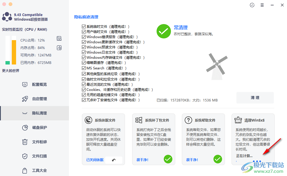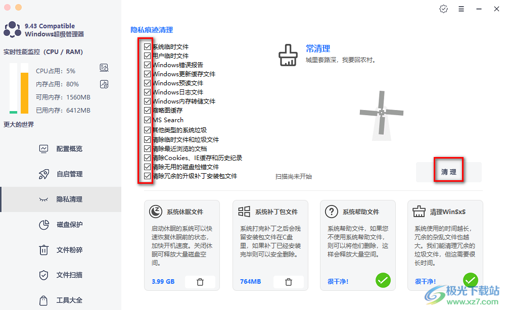 windows超级管理器是一款非常好用的电脑管理软件,可以帮助用户进行清理系统文件以及一些补丁文件等,当我们通过该软件进行清理操作之后,那么我们的电脑就会变得很干净,并且通过windows超级管理器来清理隐私文件,那么就不会担心我们的一些隐私信息被泄露的风险,特别是一些小伙伴经常会使用电脑浏览器浏览自己需要的网页网站,那么就会留下自己的一些个人信息,那么同样也是可以通过windows超级管理器将其进行清理操作,并且该软件清理隐私是非常安全的,可以放心使用,下方是关于如何使用windows超级管理器清理隐私的方法,需要的话可以看看方法教程。