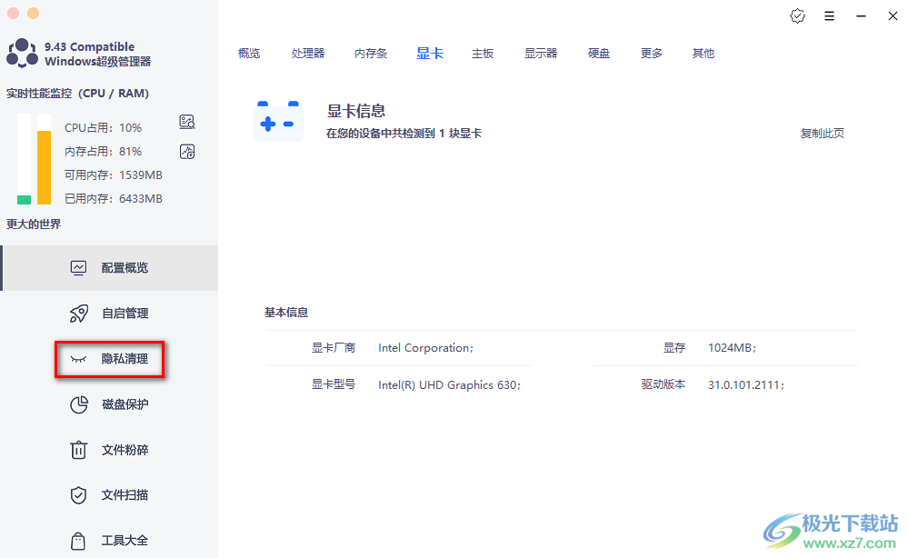 1.首先我们需要将windows超级管理器点击打开,进入到windows超级管理器的操作页面之后,可以在左侧的功能选项中选择【隐私清理】选项。