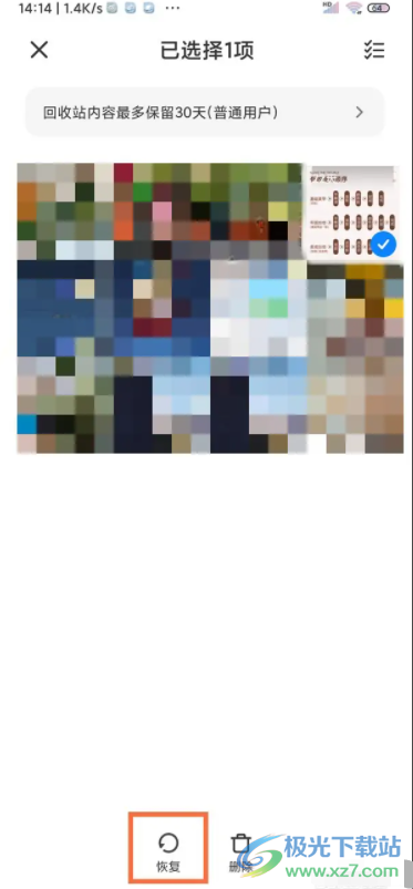 3.进入到照片回收站页面中,用户找到误删的照片并勾选起来,最后按下下方的恢复按钮就可以了