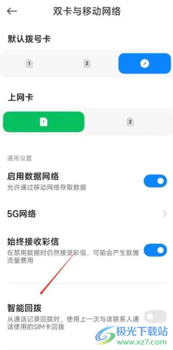 3.进入到双卡与移动网络页面中,用户直接将智能回拨选项右侧的开关标识打开即可解决问题,成功开启后,小米手机就会使用上一次与联系人通话时使用的电话卡