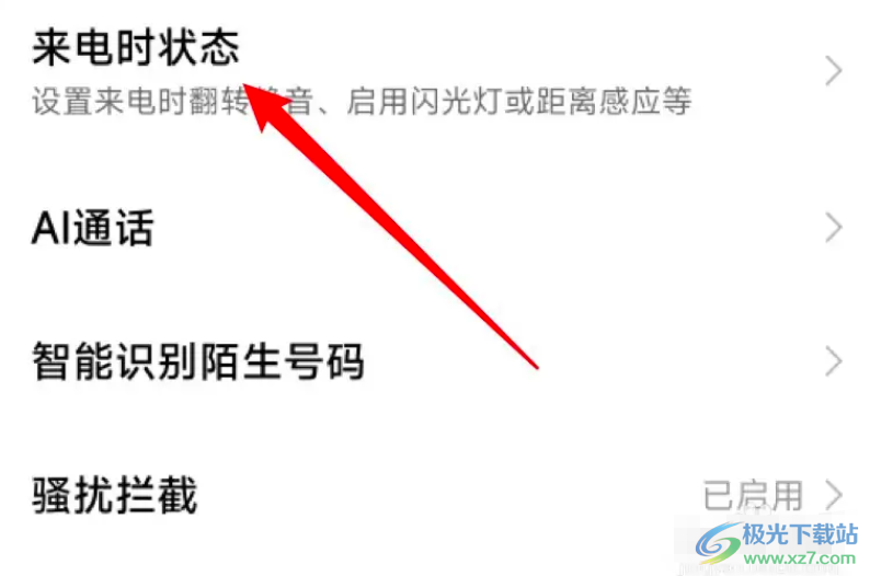 2.这时进入到电话的设置页面中,用户就由看到有ai通话、骚扰拦截、智能识别陌生号码等选项,用户选择来电时状态选项