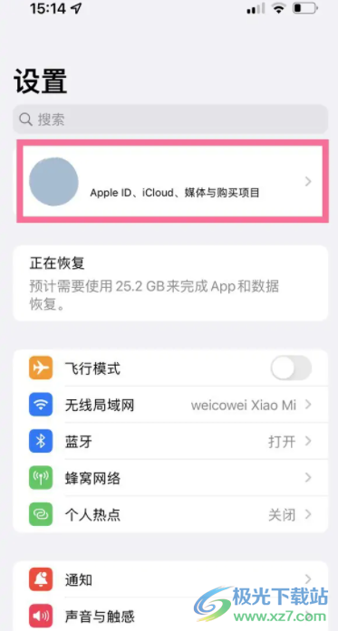 1.用户解锁苹果手机,点击桌面上的设置图标进入,在打开的设置页面中用户直接点击位于首位的apple id选项