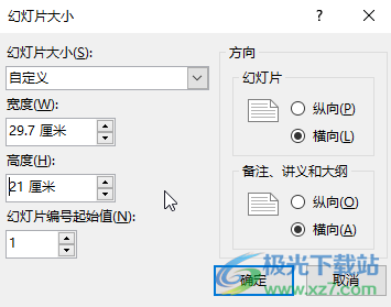 第三步:在打开的窗口中将宽度设置为29.7厘米,高度设置为21厘米,也就是A4纸的尺寸,然后进行确定;