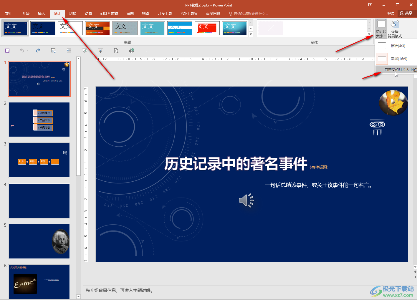 第二步:在“设计”选项卡中点击“幻灯片大小”——“自定义幻灯片大小”;