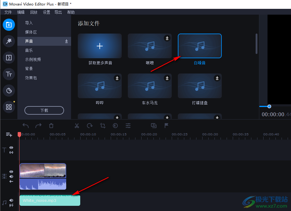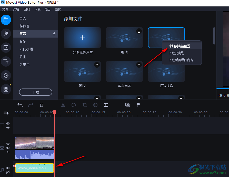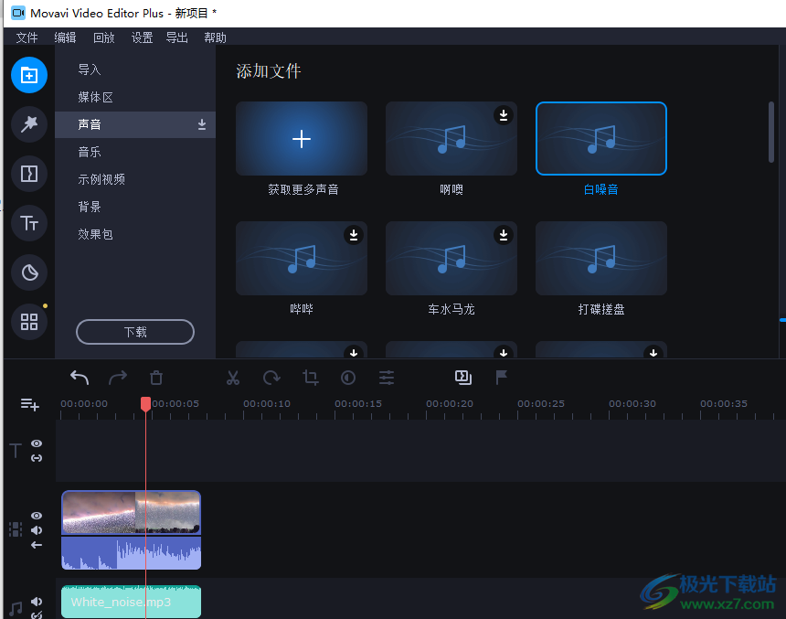 以上就是小编整理总结出的关于movavi video editor plus给视频添加白噪音的方法,我们在movavi video editor plus软件中打开一个视频文件,然后打开声音选项,找到白噪音选项,下载并将该选项拖入轨道中即可,感兴趣的小伙伴快去试试吧。