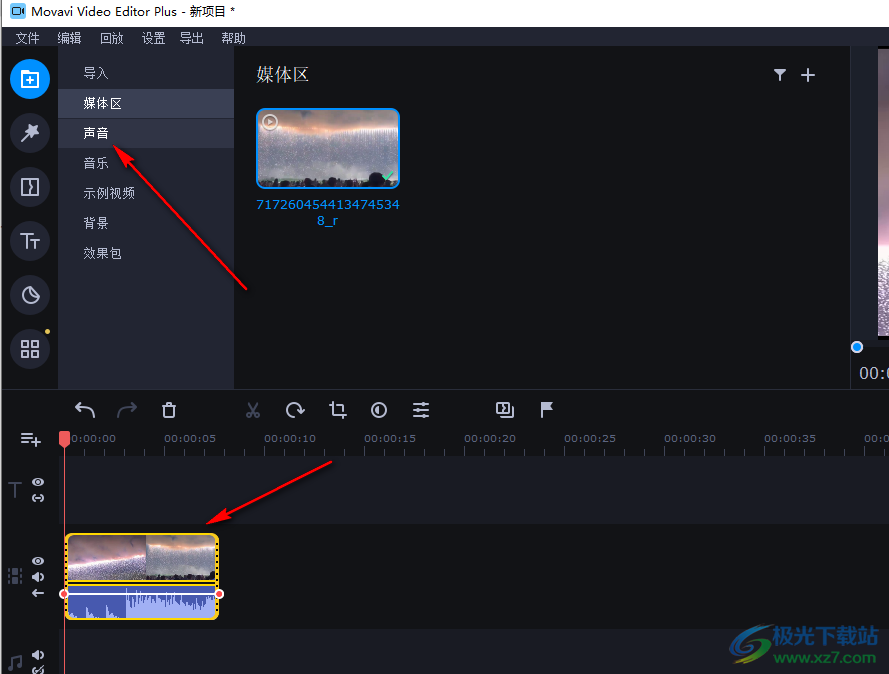 3、第三步,添加好文件之后,我们将媒体区的视频文件拖入轨道中,然后在左上角找到“声音”选项,点击打开该选项