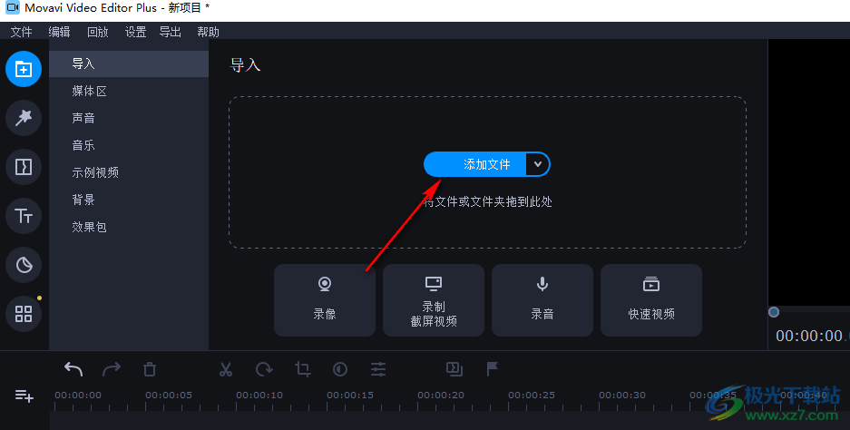 1、第一步,我们先打开电脑中的movavi video editor plus软件,然后在软件页面中点击“添加文件”选项