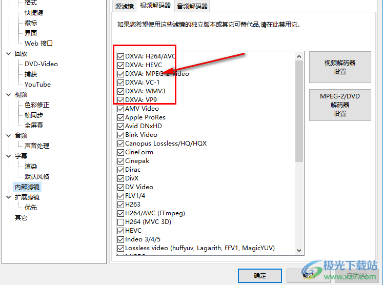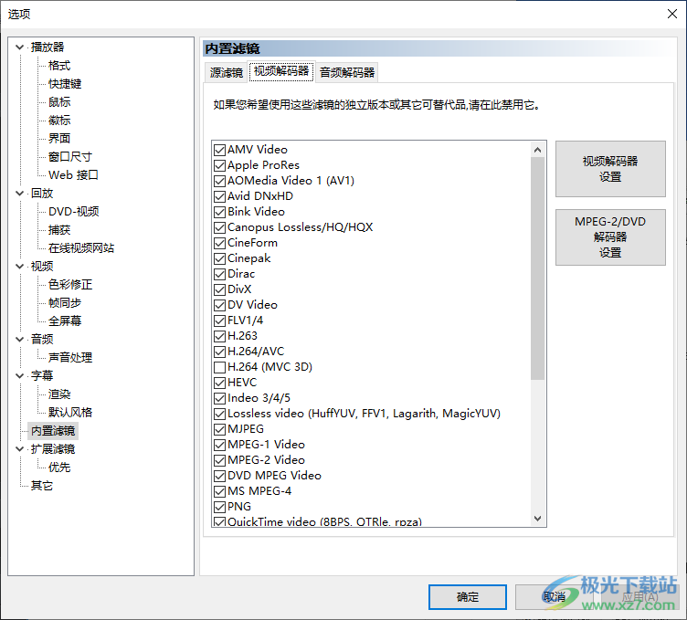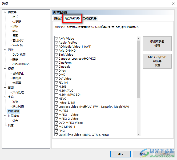 4.之后在内部滤镜的窗口页面下,将【视频解码器】选项卡点击打开,即可看到有非常多的解码器选项,如图所示。