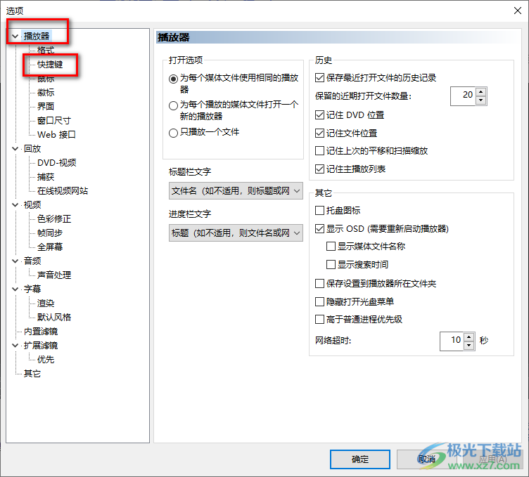 3.当我们进入到选项设置页面之后,在左侧的功能选项中在【播放器】选项的下方选择【快捷键】选项,将该选项点击打开。
