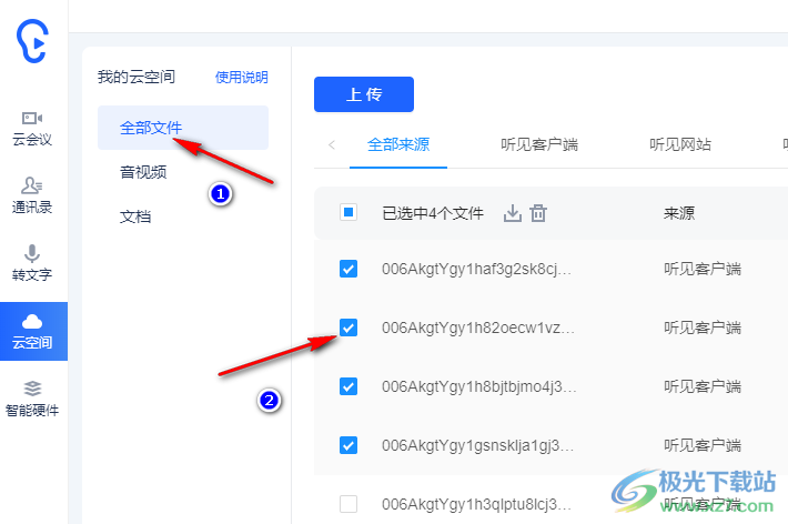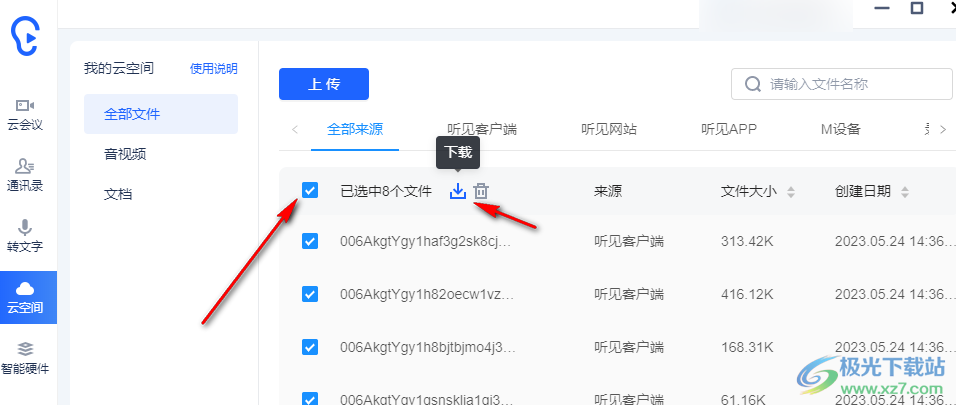 讯飞听见软件是很多小伙伴都在使用的一款智慧办公服务平台,在该软件中我们可以将语音转换为音频,还可以开启线上视频会议以及在进行视频会议时开启字幕和同声翻译功能,使用起来十分的方便。在讯飞听见中,我们还可以将文件上传到云空间中,方便在各个终端上下载并使用这些文件。在下载文件时,我们还可以一次性选择多个文件,然后进行批量下载,提高下载效率。有的小伙伴可能不清楚具体的操作方法,接下来小编就来和大家分享一下讯飞听见批量下载云空间文件的方法。