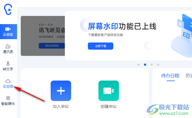 1、第一步,我们在电脑中找到讯飞听见软件,点击打开该软件,然后在页面左侧列表中打开“云空间”选项