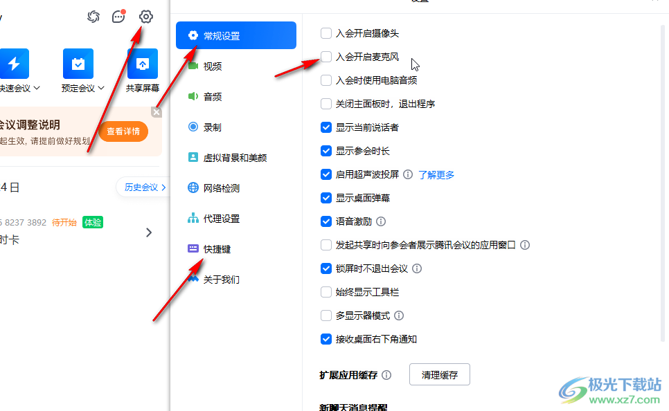 第二步:方法1.设置进入会议时自己静音:在界面右上方点击齿轮设置图标,在打开的窗口中切换到“常规设置”栏,然后点击取消勾选“入会开启麦克风”就可以了,也可以点击切换到“快捷键”栏设置快捷键后使用快捷键操作;