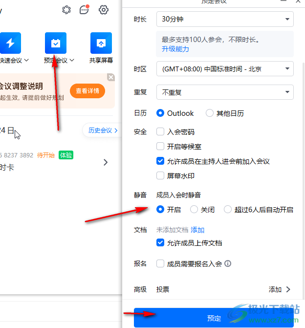 第三步:方法2.自己预定会议时设置静音:在界面中点击“预定会议”,然后在打开的窗口中往下滑动,找到“静音”栏,点击“开启”,设置好其他需要的预定会议参数后点击“预定”就可以了;
