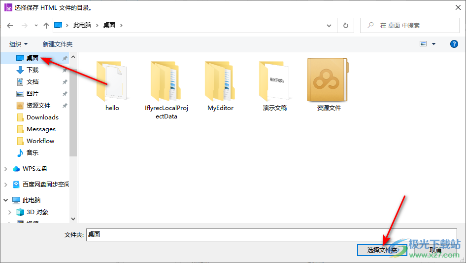 4.在页面上打开的本地文件夹中,我们需要对html文件选择一个合适的保存位置,选择好之后点击【选择文件夹】即可保存。