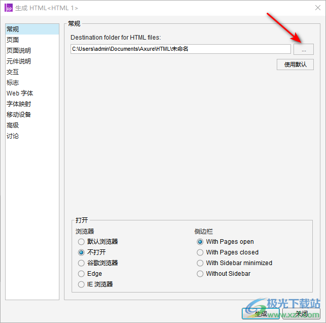 3.随后会在页面上弹出一个生成html文件的窗口,在该窗口中选择左侧的【常规】选项卡,在右侧你可以根据自己的需要来设置一下存放路径,点击【…】图标进行选择存放位置。