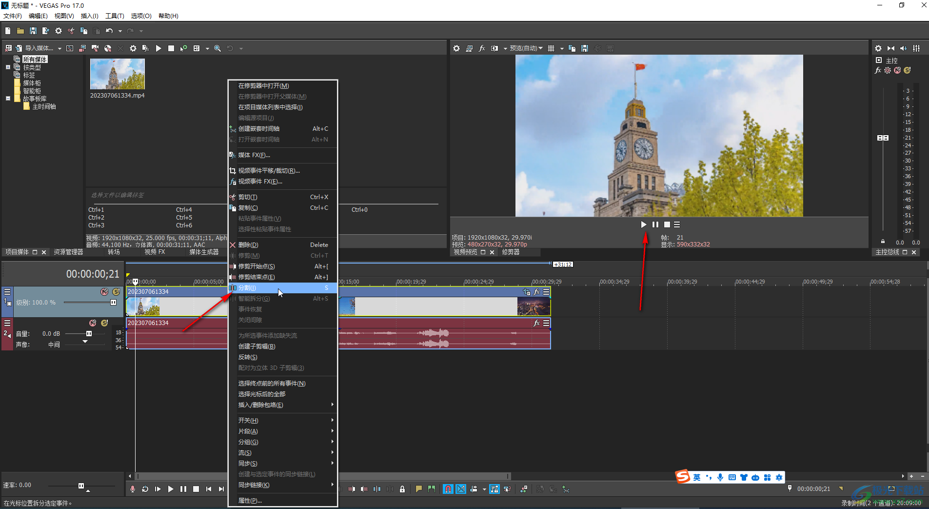 第五步:后续可以点击播放查看效果,在时间轴右键点击还可以进行分割等操作,将不需要的视频片段单独分割出来后,可以进行删除等操作。