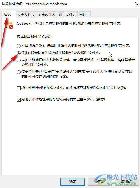 以上就是电脑版Outlook邮箱中选择垃圾邮件保护级别的方法教程的全部内容了。以上步骤操作起来都是非常简单的,小伙伴们可以打开自己的软件后一起动手操作起来。