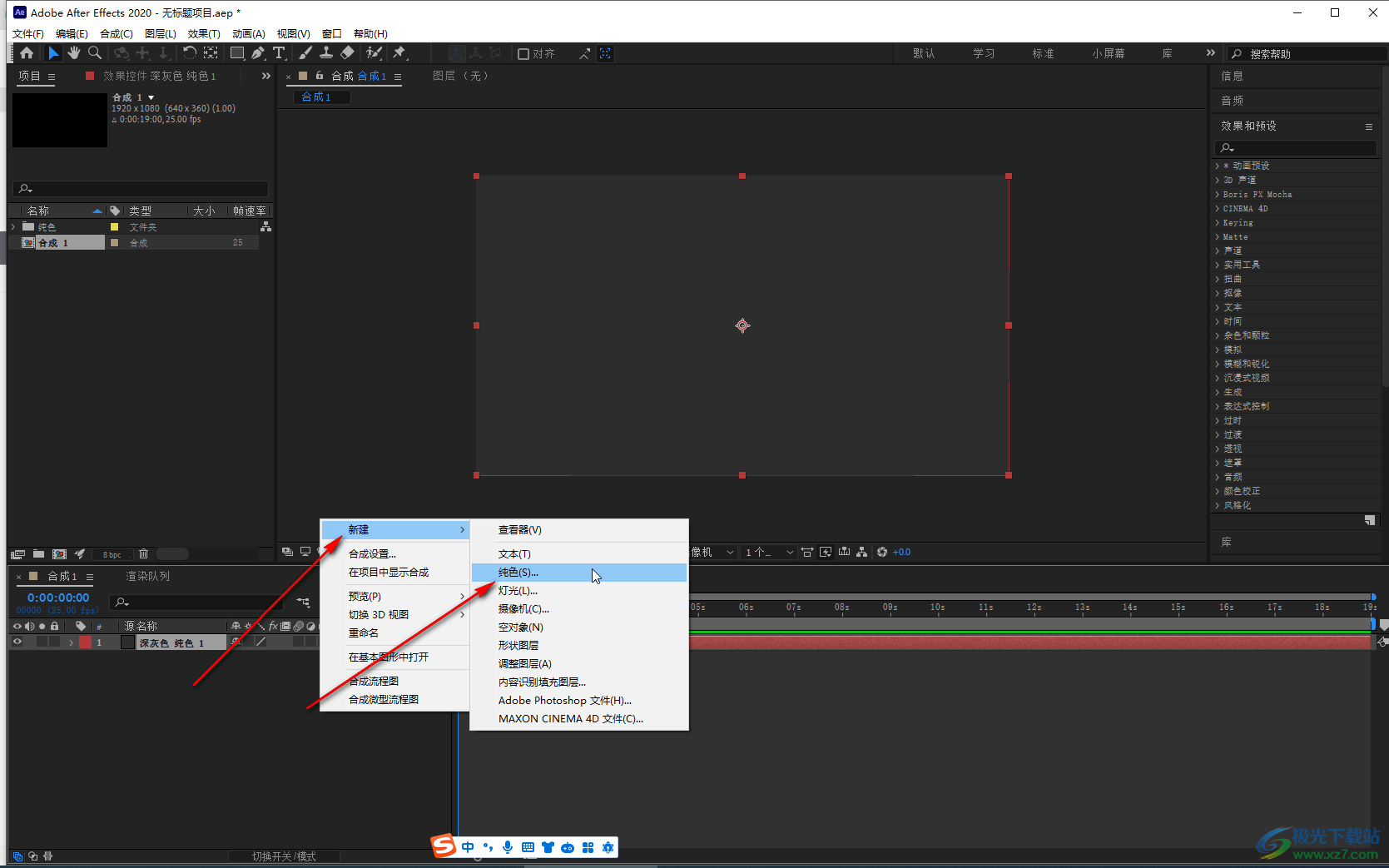 第三步:接着可以在界面左下角新建纯色层,然后按F3键左上方就可以看到“效果控件”了;