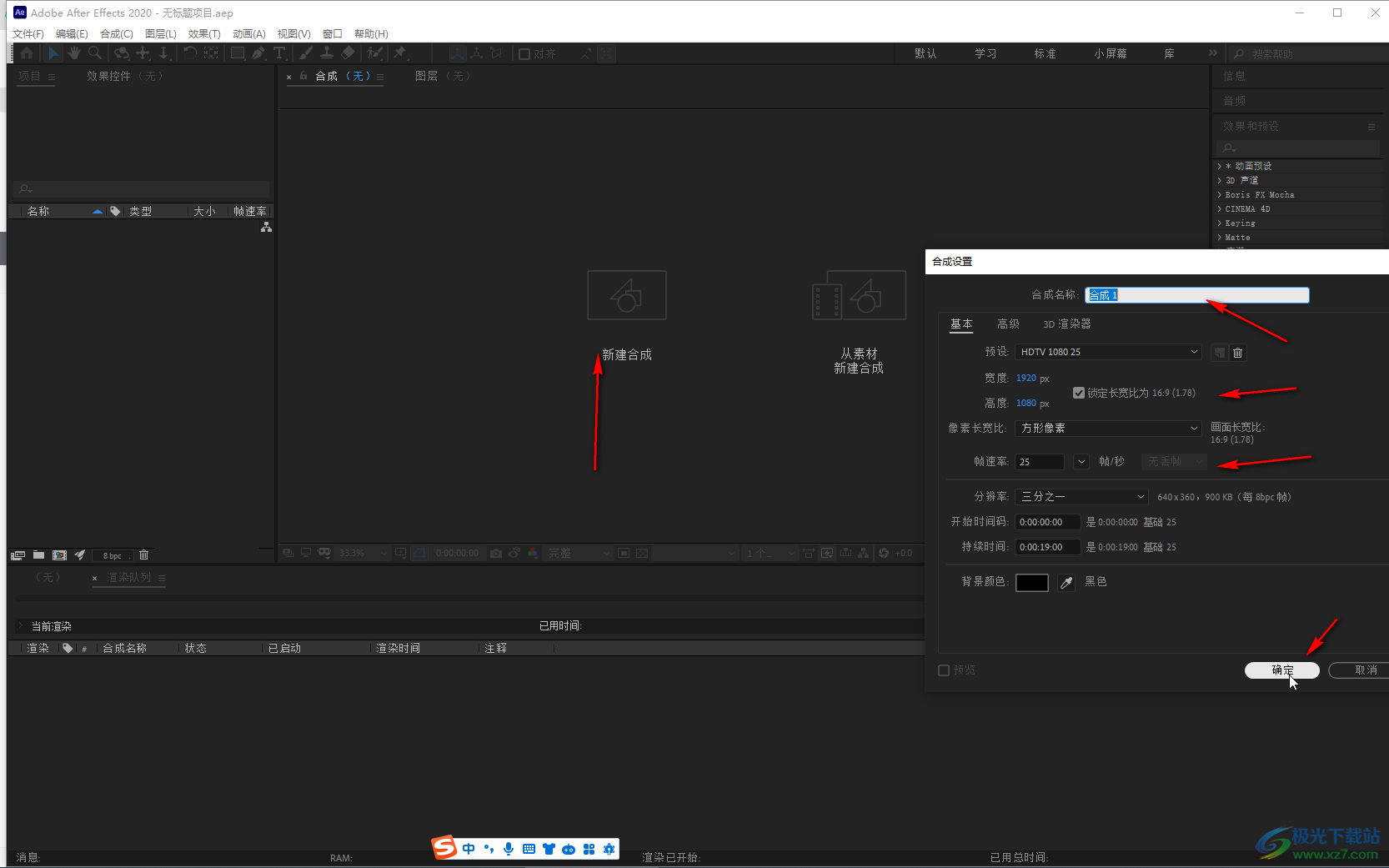 第二步:点击“新建合成”,在打开的窗口中根据需要设置参数并确定;