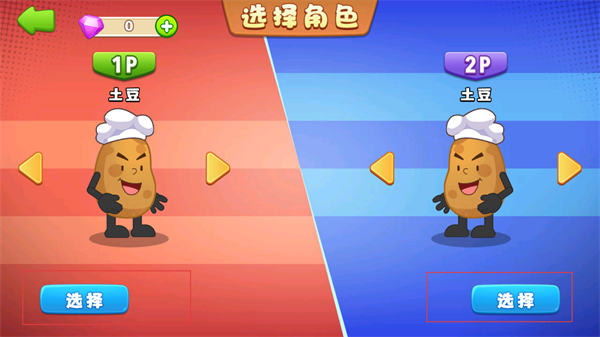 2、在选择角色界面,1P和2P玩家分别选择角色(如土豆厨师),进入游戏场景。