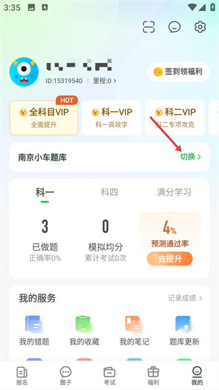 2、在个人中心界面,找到“南京小车题库”右侧的“切换”按钮并点击,进入题库选择配置页面。