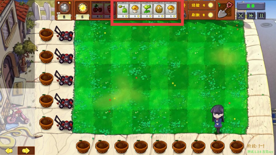 2、在关卡中,合理选择并使用红框内的植物,如豌豆射手、蘑菇等,根据阳光数量搭配植物阵容。