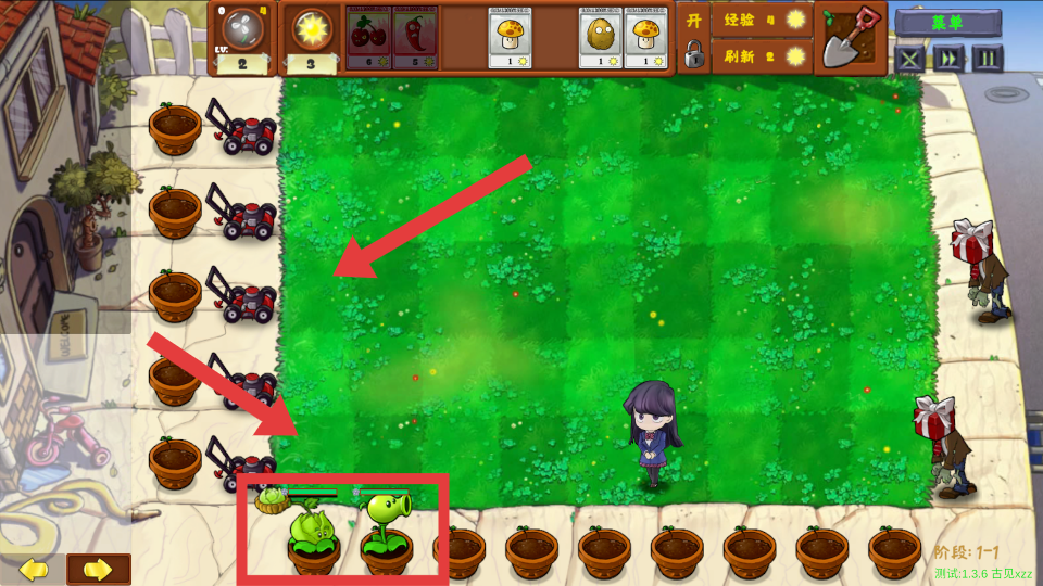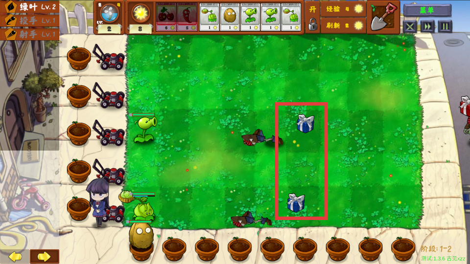 4、注意收集红框内的礼物盒,可获得植物、阳光等奖励,助力后续关卡的植物种植和战斗。